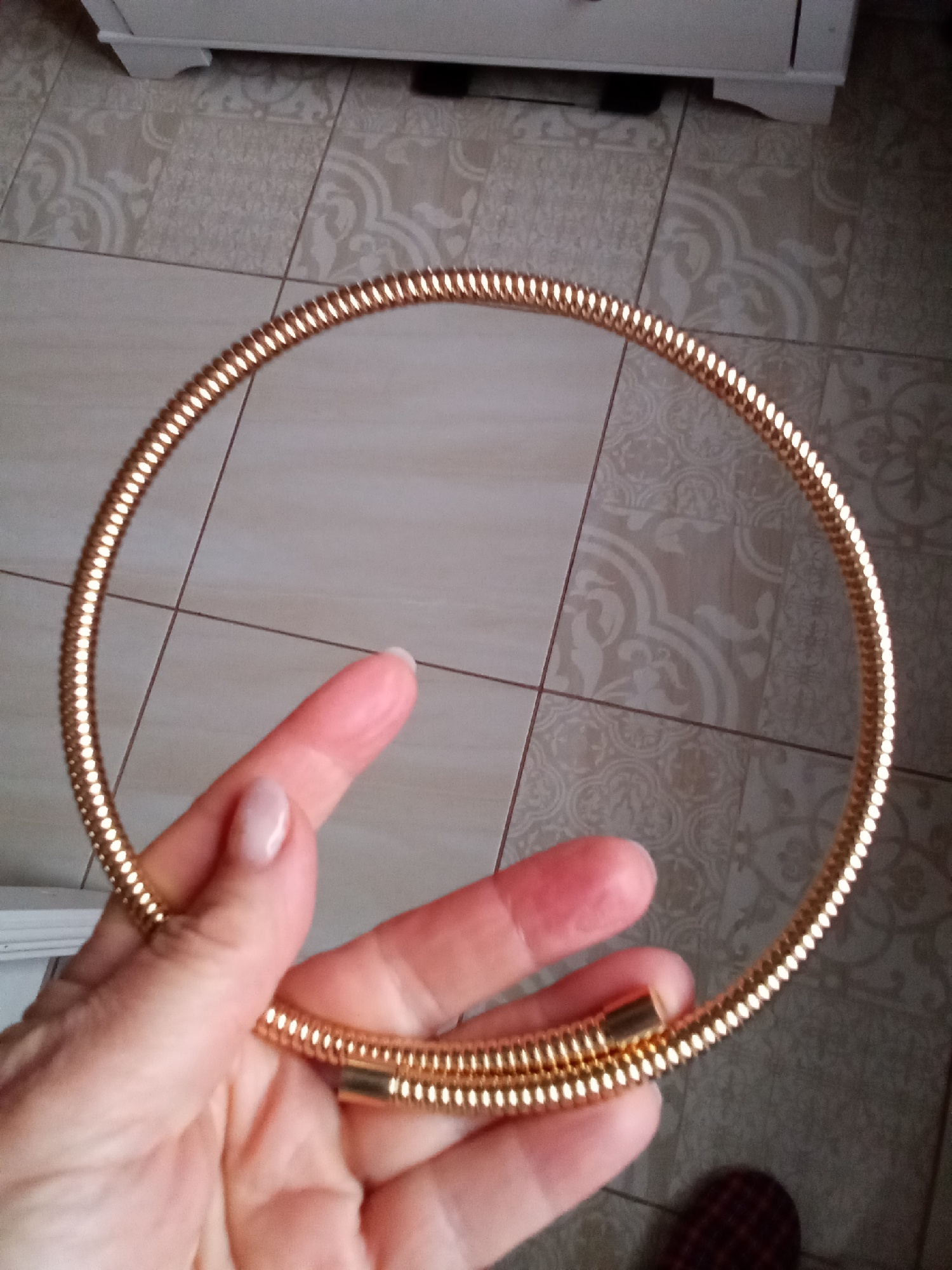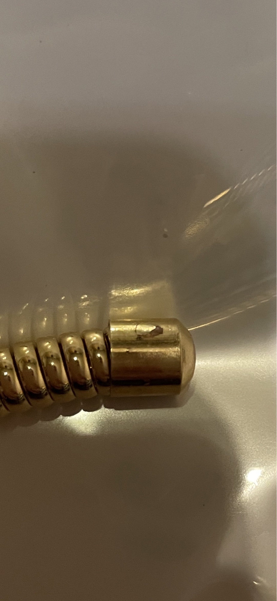 Received a defective item. The caps at the ends are pink, one of which was inserted crookedly and apparently was squeezed, hence there are marks of scratches and dents. I won't wear it; the defect is visible.