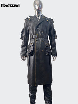 Nerazzurri Spring Autumn Cool Long Waterproof Distressed Black Pu Leather Trench Coat Men Belt Pockets Luxury Designer Clothes