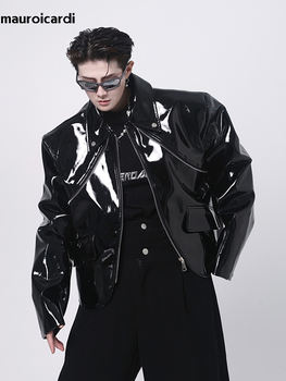 Mauroicardi Spring Autumn Cool Loose Short Black Shiny Reflective Patent Faux Leather Jacket Men Zipper Luxury Designer Clothes