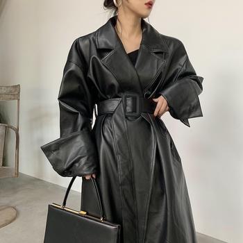 Lautaro Long oversized leather trench coat for women long sleeve lapel loose fit Fall Stylish black women clothing streetwear