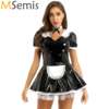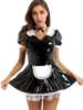 Ladies V Neck Short Sleeve Patent Leather Lace Trimming Maid Fancy Dress Costume.