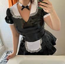 Ladies V Neck Short Sleeve Patent Leather Lace Trimming Maid Fancy Dress Costume.
